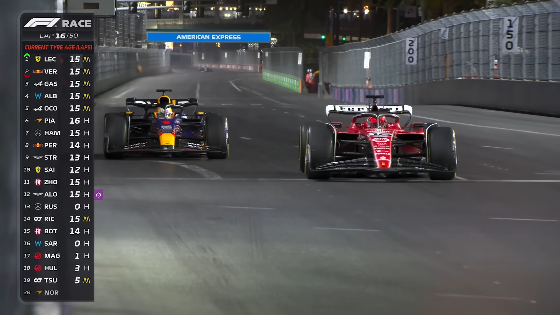 세이프티카가 해소된 후, 러셀, 오콘, 페레즈, 피아스트리, 해밀턴 등이 올라오는 가운데, 그때까지 상위권(P6)을 지키던 사전트가 한 계단씩 양보를 시작했다. 15랩이 되자 르클레르를 제외한 모든 미디엄 타이어의 페이스가 급격히 떨어졌고, 러셀은 3위에서 피트인, 사전트는 9위까지 내려온 채 피트인했다. '르클레르를 제외한 미디엄'에는, 1위 베르스타펜도 있었다. 16랩에서, 르클레르는 베르스타펜을 추월하고 레이스 리더로 올라섰다! 셋업 단계에서 타 팀보다 냉각에 좀더 신경을 쓴 듯, 페라리는 타이어 수명에서 확실한 비교우위를 자랑했다. 게다가 1위를 내주자마자 피트인한 베르스타펜은 5초 페널티도 수행한 뒤 11위로 피트아웃 했고. 르클레르와 2등 사이의 간격은 점점 벌어지기만 했다. 드디어 그에게서 폴투윈의 기운이 피어오르기 시작했다.